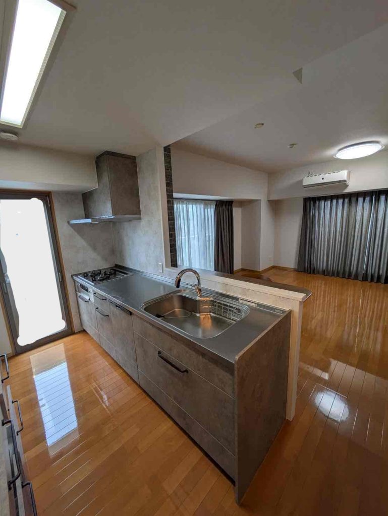 グレーの石目調キャビネットとステンレスカウンターを採用し、落ち着いた高級感を演出☆