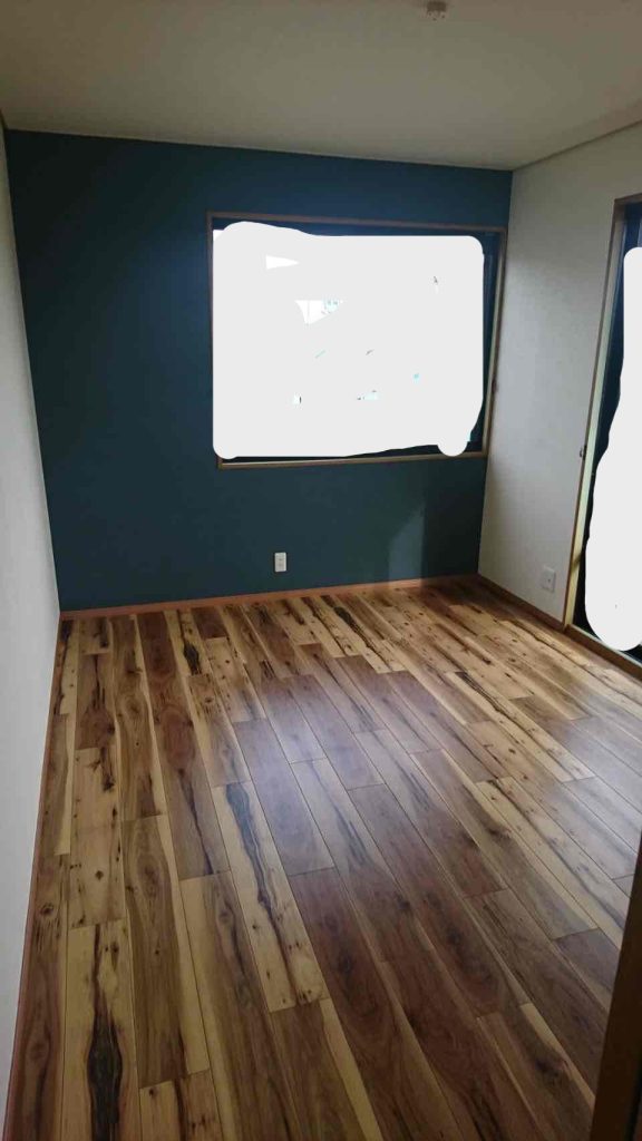 明るい木目のフローリングに濃い色のアクセントクロスを組み合わせることで、